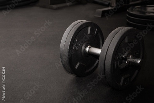 Naklejka premium Black dumbbell resting on gym floor after intense workout