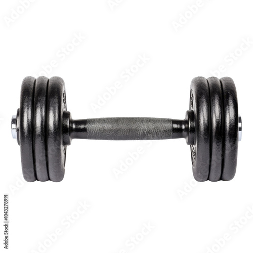 © Ketsarinya, Fototapeta premium black dumbbell with textured grip, ideal for strength training and fitness workouts. This equipment is perfect for building muscle and enhancing physical fitness