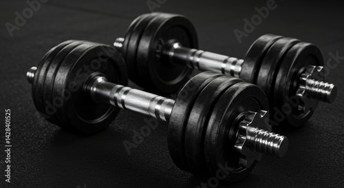 Fototapeta premium Black dumbbells resting on a dark gym floor. Fitness equipment for a workout...