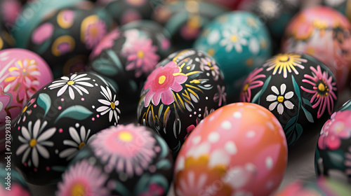Fototapeta premium Black Easter eggs are painted with bright patterns.