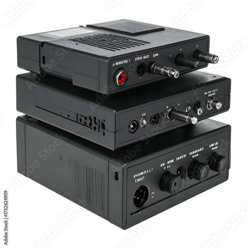 Obraz premium Black electronic audio equipment devices stacked together.