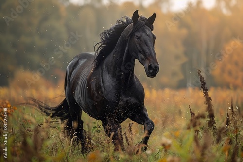 Obraz premium Black elegance stallion horse, a mammal, with some beautiful sleek fur running in the warming sunlight and a plain that's full of tall grass in the forest.