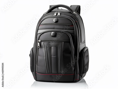 © Aisyaqilumar, Fototapeta premium Black executive backpack isolated on plain color background. Made of high quality fabric and pvc. Has many compartments to put essentials.
