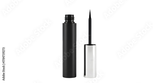 © Nazia, Fototapeta premium Black Eyeliner Cosmetic Product Shot with Open Silver Cap and Applicator Brush isolated PNG with Transparent Background