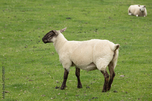 Naklejka premium Black faced sheep standing on green grassy pasture in rural countryside