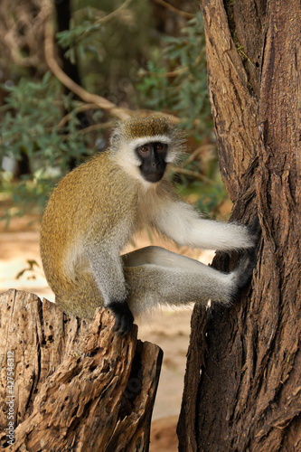 Obraz premium Black-faced vervet monkey sitting on tree stump, Samburu Game Reserve, Kenya