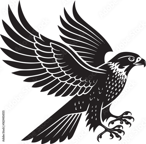 © MDYeakub, Fototapeta premium Black falcon in flight with spread wings bird talons