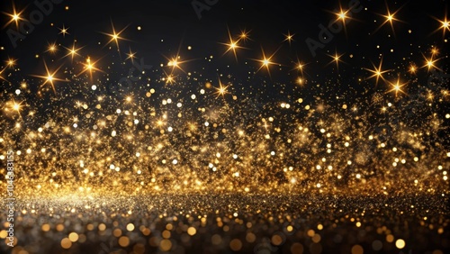 © Watcharapon, Naklejka premium Black festive background with abstract scattering of gold sparkles, holiday backdrop, festive, black, abstract