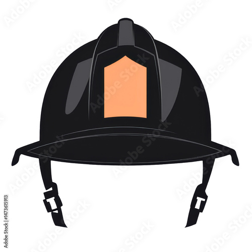 Fototapeta premium Black firefighter helmet with orange shield and chin straps, symbolizing...