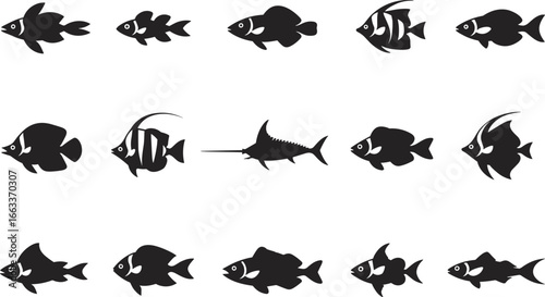 © Shafik Creatives, Naklejka premium Black fish silhouette vector set, marine animal icons, ocean life illustration, aquatic wildlife design, underwater creature collection, sea animal graphic elements