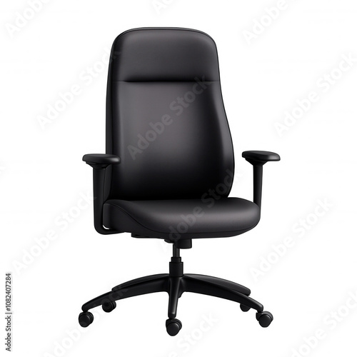 © diowcnx, Fototapeta premium Black five-wheeled office chair with adjustable backrest and cushioned seat, isolated on white background for maximum detail visibility.