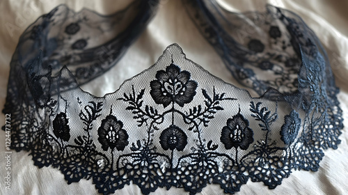 © cris, Obraz premium Black floral lace trim on beige fabric background; craft, fashion, textile