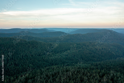 © YesPhotographers, Naklejka premium Black Forest drone aerial view, horizon over mountains in the evening