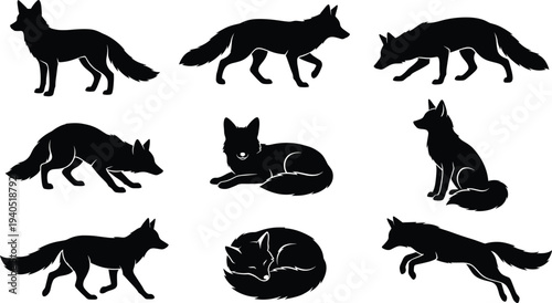 © PINKI, Naklejka premium Black fox silhouettes in various poses including jumping, sitting, running, and sleeping, isolated on white background vector illustration