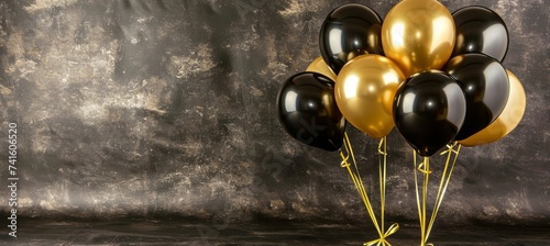 Naklejka premium Black friday sale ad with elegant black and gold balloons, text space, shopping concept.