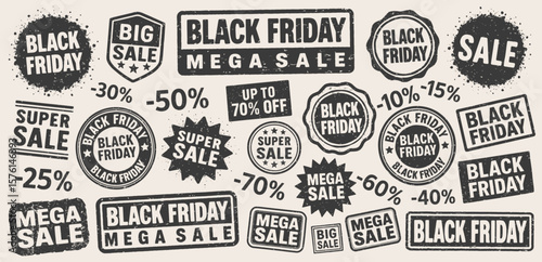 Obraz premium Black Friday Sale grunge stamp vector set. Black Friday retro rubber stamp template collection. Mega sale stamp pack. Seal Black Friday. Vector illustration image. Isolated on white background.