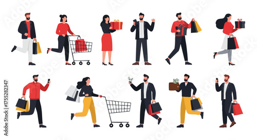 Naklejka premium Black Friday Shopping Vector, People with Bags and Gifts, Holiday Sale Illustration