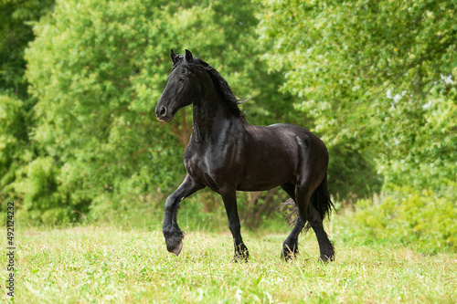 © Rita Kochmarjova, Fototapeta premium Black friesian horse running in the field in summer