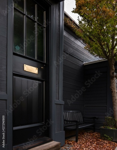 Fototapeta premium Black front door of black house, tree and bench