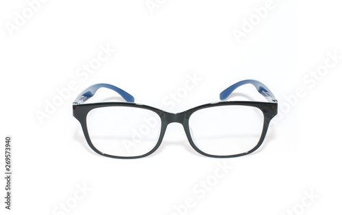 Fototapeta premium Black glasses, black frame in blue frame Shiny black for visually impaired people, isolated on a white background