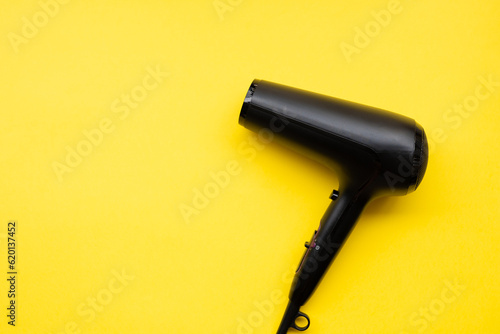 Fototapeta premium Black hair dryer on blue and yellow paper background