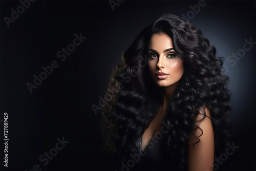 Fototapeta premium Black hair woman. Beautiful brunette hairstyle fashion portrait with beauty long black hair over black background. fashion interior photo of gorgeous woman with long dark hair
