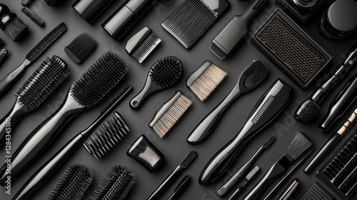 Fototapeta premium Black Hairdressing Tools Arranged on Dark Background