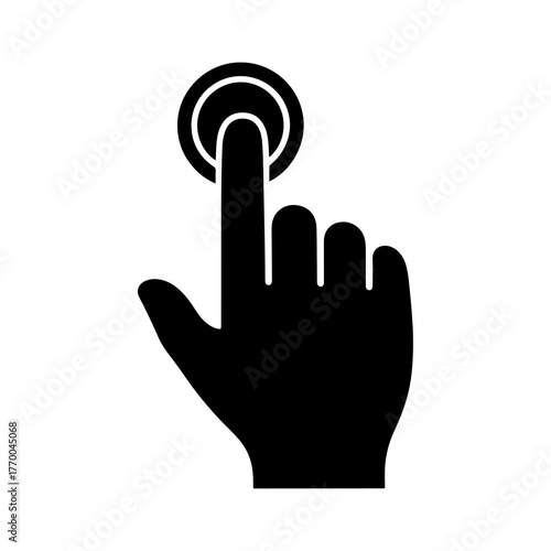 © Basecamp, Obraz premium Black Hand Pointer Finger Icon Symbol Pressing a Circular Button on a White Background, Digital Interface Gesture