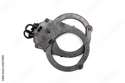 © Dmitriy, Obraz premium Black handcuffs isolated on the white background.