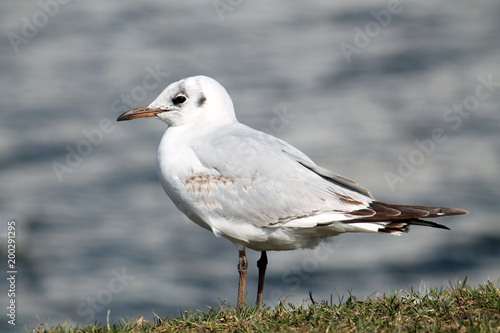 Fototapeta premium Black-headed gull (Chroicocephalus ridibundus) in juvenile plumage against blue water background