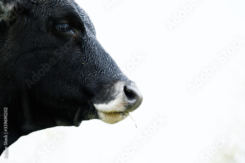 © ccestep8, Fototapeta premium Black heifer cow isolated on white background, close up of face in profile view.