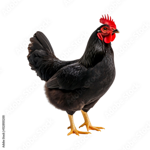 © wannapong, Fototapeta premium Black hen with striking feathers and bright comb standing on white background