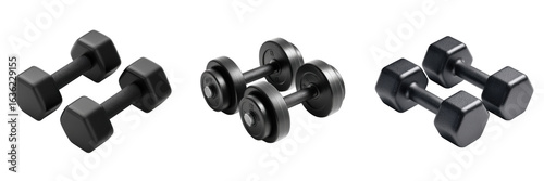 Fototapeta premium Black hexagonal and round dumbbells arranged in three pairs isolated on a transparent background weights
