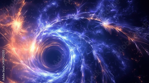 Fototapeta premium Black hole blue orange energy waves emanating abstract cosmic background event horizon universe's fabric warps swirling gas clouds particle aquatic particles