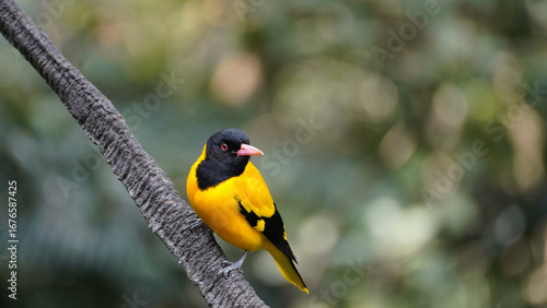 © Mekarim1983, Fototapeta premium black-hooded oriole (Oriolus xanthornus) perched on tree branch against greenish background