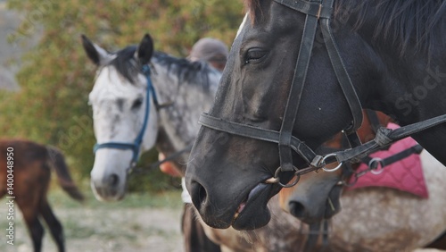 Obraz premium Black horse wearing bridle standing near handler and other horses, ready for...