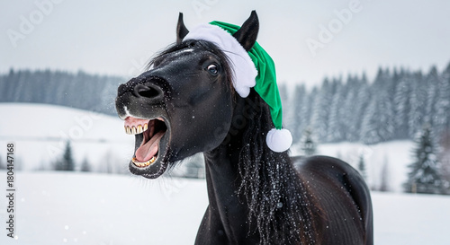© PhotoArtHub, Obraz premium Black horse with open mouth, wearing green santa hat on snowy field. Festive, humor, holiday concept, funny, festive mood, laughter, animal portrait.