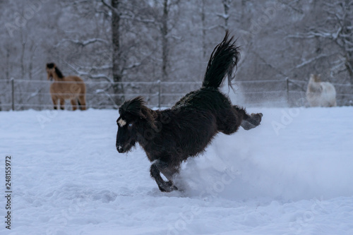 © Magnus, Naklejka premium Black Icelandic horse with blue eyes bucking in deep snow