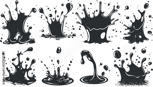 © vadymstock, Naklejka premium Black ink splash design elements on a white background.