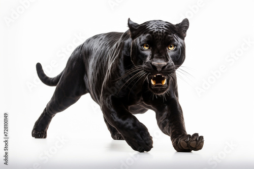 © Laser Eagle, Obraz premium Black Jaguar leaping toward the camera on a white background, feline front portrait