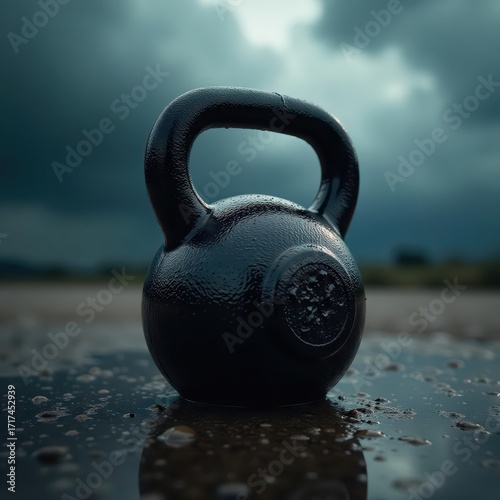 © Keerati, Fototapeta premium Black kettlebell, glistening wet surface, stormy sky , texture, workout, training