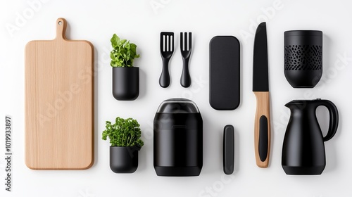 Fototapeta premium Black Kitchen Utensils and Accessories with Wooden Cutting Board