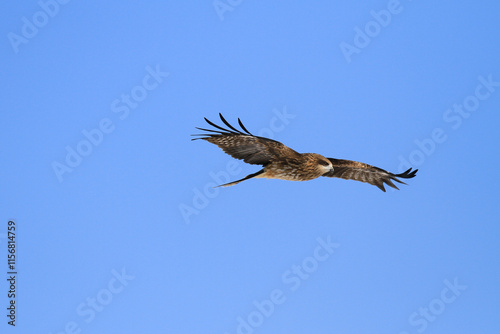 Obraz premium Black Kite Soaring in a Clear Blue Sky, Hokkaido, Japan