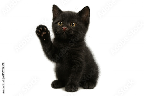 © Sandra, Obraz premium Black kitten raising paw, waving hello, looking at camera, cute pet on transparent background