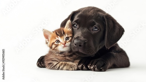 © The Little Hut, Obraz premium Black labrador puppy hugs tiny kitten Pets look away on empty space together Isolated on white background : Generative AI
