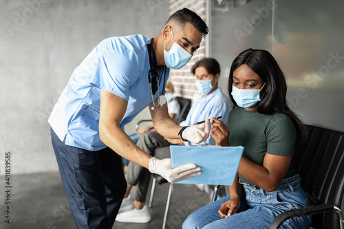 © Prostock-studio, Obraz premium Black lady in face mask signing medical file before vaccination