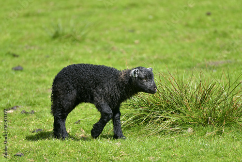 © davidyoung11111, Fototapeta premium Black lamb by Loughrigg Tarn, English Lake District