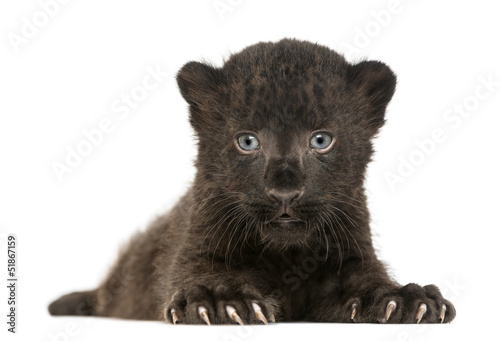 © Eric Isselée, Obraz premium Black Leopard cub facing and lying down, 3 weeks old, isolated