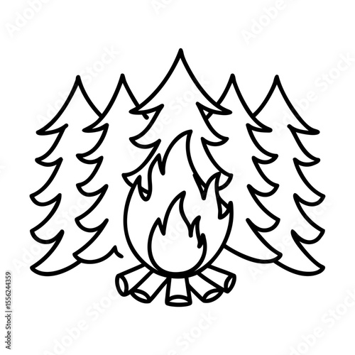 Obraz premium Black line art campfire with flames and pine trees illustration