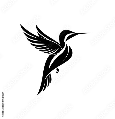 © LS, Fototapeta premium Black line art shows a flying hummingbird against a black surface, for use as a minimalist design, logo, or social media graphic.